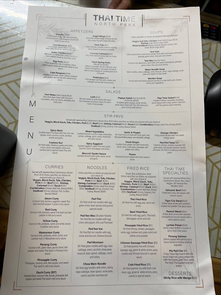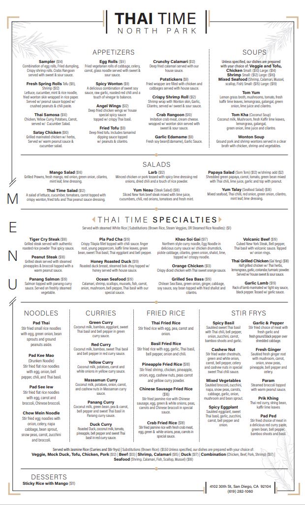 Welcome to Thai Time North Park, where vibrant flavors meet an inviting atmosphere in the heart of San Diego. Located at 4102 30th St, this cozy restaurant offers a menu rich with authentic Thai dishes that are sure to tantalize your taste buds. The experience begins with enticing starters like fresh spring rolls and garlic wings, leading to main courses such as the signature Pad Thai, renowned for its perfect balance of sweetness and spice.